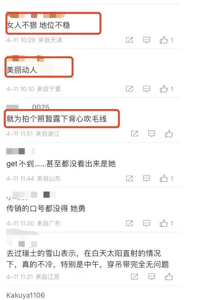 在驳倒区阴阳怪气起来,以至吐槽。 有东谈主说女东谈主不狠,地位不稳。       还有东谈主嗤之以鼻,以为太勇了,不知谈思要传达什么。       以至有东谈主说这是在给羽绒服作念代言。